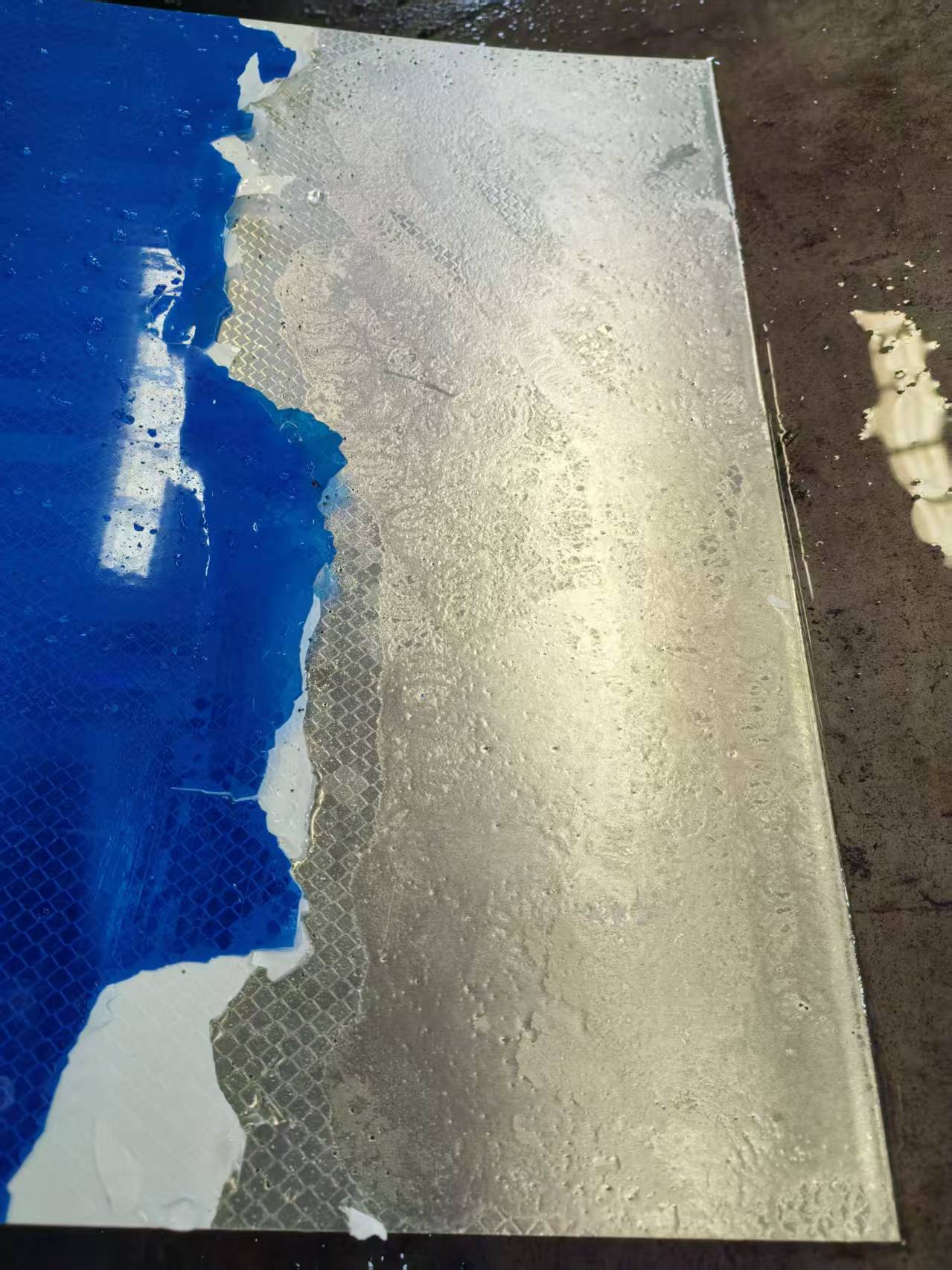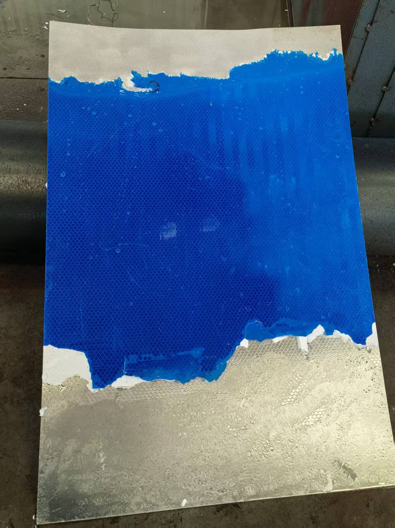 - 如果需要高压清洗的话,只需要把贴合层打掉就行,然后再贴上新的材料,这样反光膜表面的一层膜就被轻松清除了。在实验过程中,我们用500公斤高压清洗机轻松就把反光膜打掉了,前后对比大家也可以看一下。
